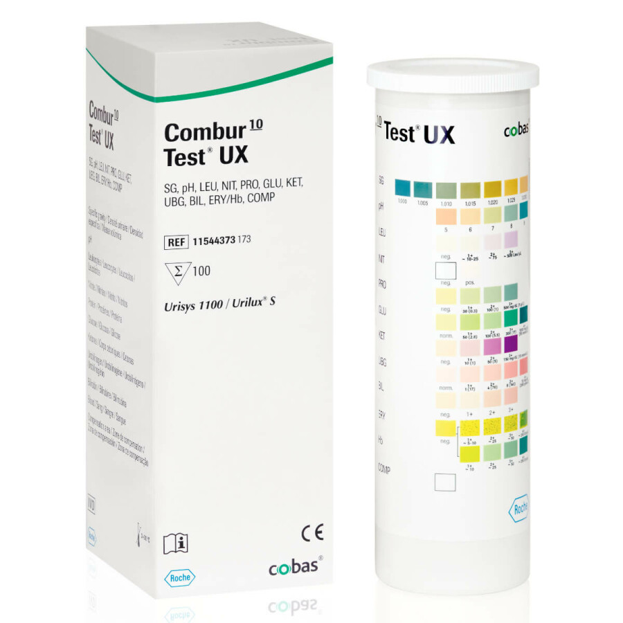 - Combur 10 Test UX: Protein, Glucose, Nitrit, Leukozyten, Blut, pH, Ketone, Bilirubin, Urobilinogen, s.g.Urinanalysegerät Urisys 1100