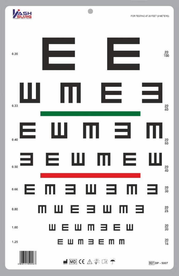 - Die Sehtafel enthält rote und grüne Farbbalken für einen einfachen und hilfreichen Farbsehtest.