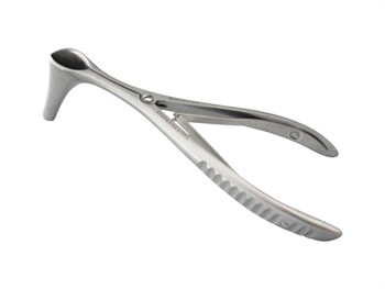 The Killian Hartmann nasal speculum is the ideal instrument for nasal examinations. By pressing the handle, the speculum opens and pushes aside the nasal walls, providing the doctor with a clear view of the patient's nasal cavity. The nasal speculum is 14 cm long. The parts entering the nose are approximately 75 mm long. This instrument can be cleaned in an ultrasonic or autoclave.