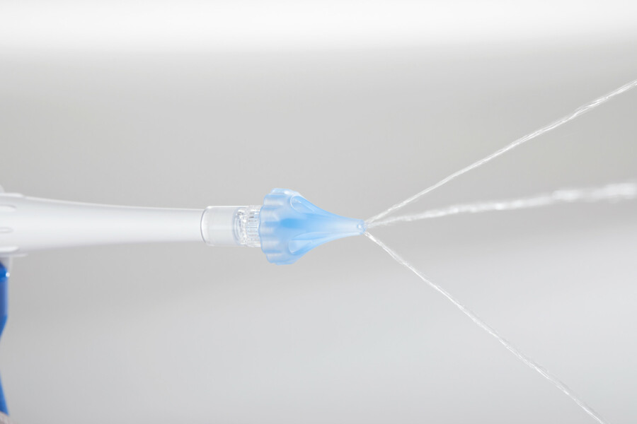 OtoClear-tips voor oorirrigatie leiden het water naar de gehoorgangwand, met drie verschillende stromen, in plaats van rechtstreeks naar het trommelvlies. De punt is ook ontworpen met een zacht, flexibel materiaal voor comfort van de patiënt en een wijd uitlopend ontwerp om terugslag en overmatig inbrengen te voorkomen.