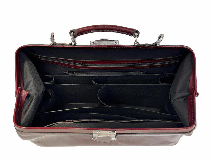 - Aan de andere zijde van de binnenkant van de tas zijn drie leren compartimenten voor het insteken van instrumenten waar u met één greep over kunt beschikken, denk aan een reflexhamer, ooglamp of thermometer. Duidelijk in het zicht.