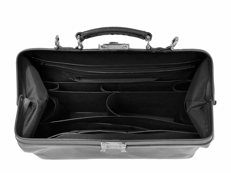 - Vakindelingen voor uw instrumentarium, gefixeerd door drukknopen aan één zijde. De vakindeling is gemakkelijk te verwijderen zodat u de tas als aktetas kan gebruiken.