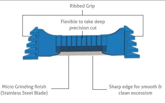De Dermal Blade is uitgerust met een ergonomisch handvat dat een veilige en comfortabele grip biedt, waardoor gebruikers gecontroleerde en nauwkeurige bewegingen kunnen uitvoeren. Het lichtgewicht ontwerp maakt het gebruik gemakkelijker en vermindert vermoeidheid van de hand, waardoor het ideaal is voor langdurig gebruik.