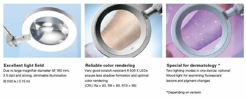 De OPTICLUX heeft alles wat een moderne loeparmatuur moet hebben: een robuuste loep met 1,9-voudige vergroting, de nieuwste LED modules, ergonomisch beproefde armscharnieren en intuïtive bediening. Het bijzondere pluspunt van de OPTICLUX is zijn grote lichtveld in daglichtkwaliteit, de uitmuntende kleurweergave-eigenschappen en onderhoudsvrije levensduur Als goedgekeurd medisch product is het veelzijdig inzetbaar in de dermatologie, in ziekenhuizen en praktijken voor humaan geneeskundige, tandgeneeskundige en diergeneeskundige doeleinden, in laboratoria en ook voor de controle van gesteriliseerde voorwerpen.