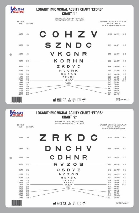 Gestandaardiseerde Sloan Letter-kaart voor dichtbijzicht bij volwassenen met proportioneel verdeelde (logMAR) lijnen in ETDRS-formaat; lijnmaten variëren van 20/400 tot 20/10 (6/120 tot 6/3) equivalent. Dit formaat bevordert natuurlijk lezen van links naar rechts, terwijl de lettergrootte afneemt, waardoor het testen in veel gevallen sneller en eenvoudiger wordt. Deze dichtbijzichtkaart gebruikt dezelfde gekalibreerde Sloan-optotypes en ETDRS-formaten, alleen met een unieke oriëntatie.