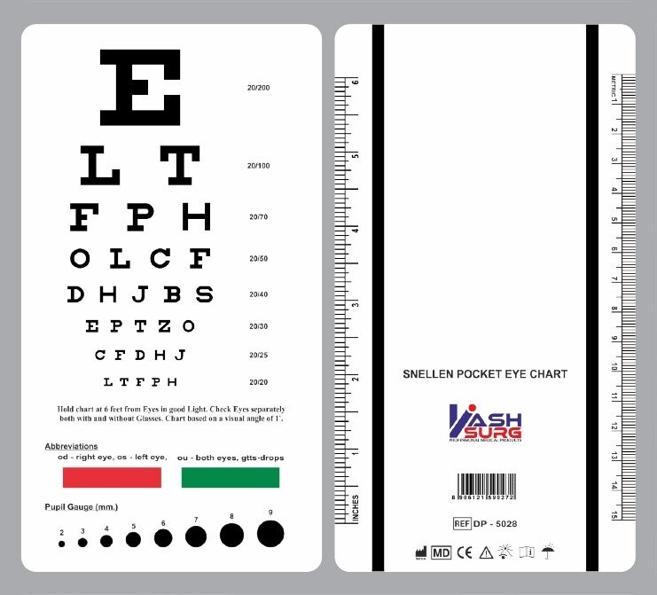 - Inches/centimeter liniaal + pupildiameterkaart.